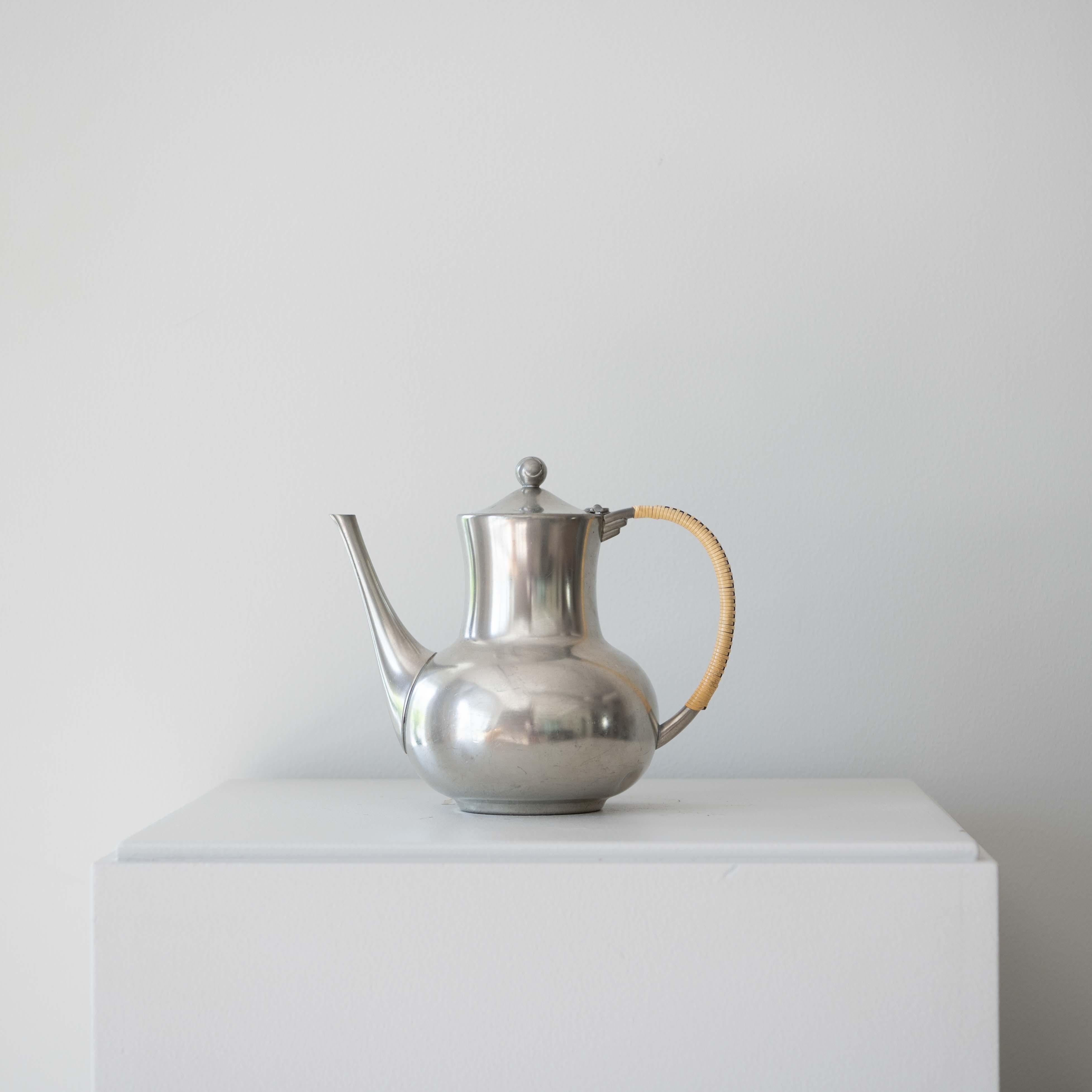Vintage silver tea/coffee pot with a wicker wrapped handle, perfect for adding a stylish element that complements the Fronteriors aesthetic.